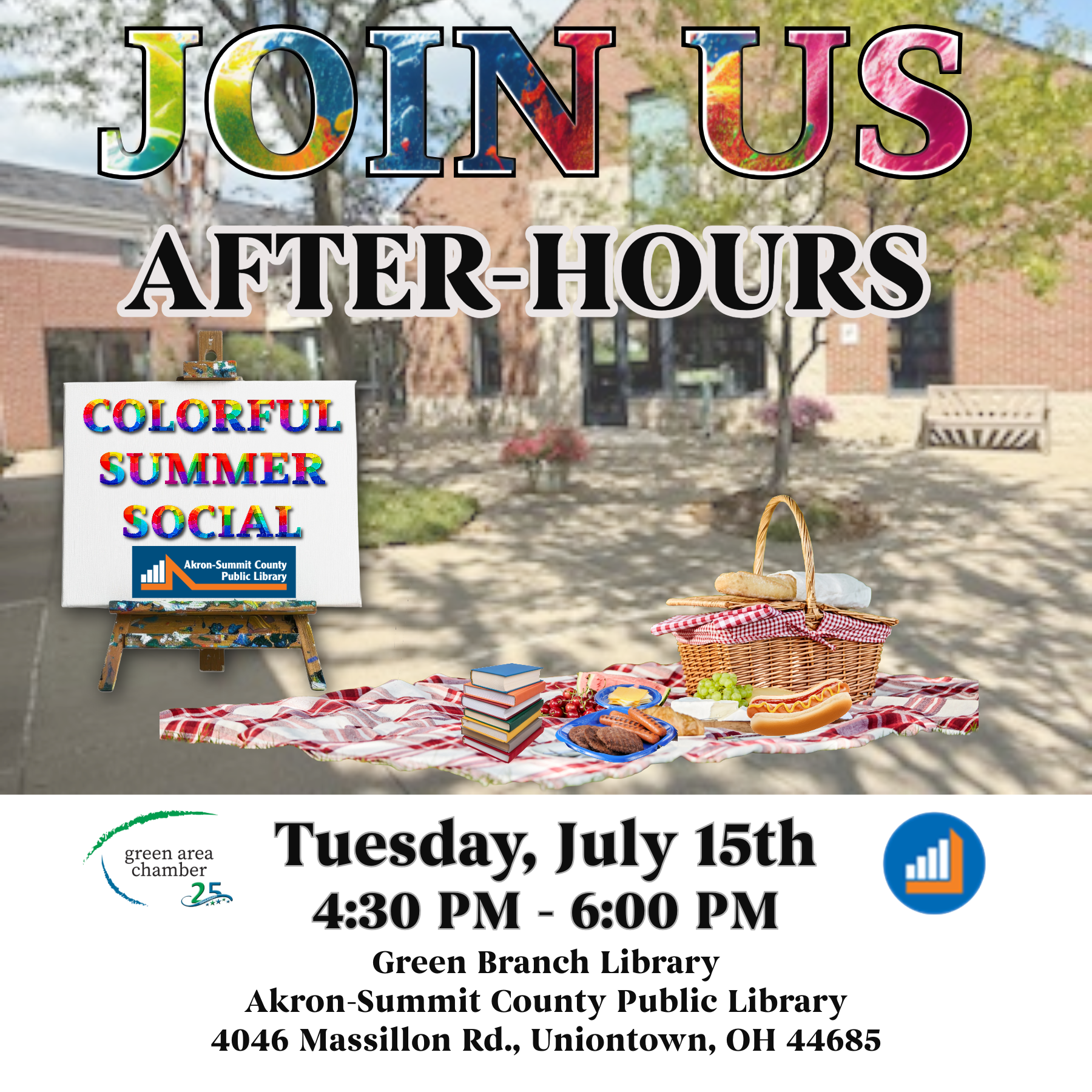 July’s after-hours is on Tuesday, July 15, 4:30-6:00pm, at the Green Branch Library!